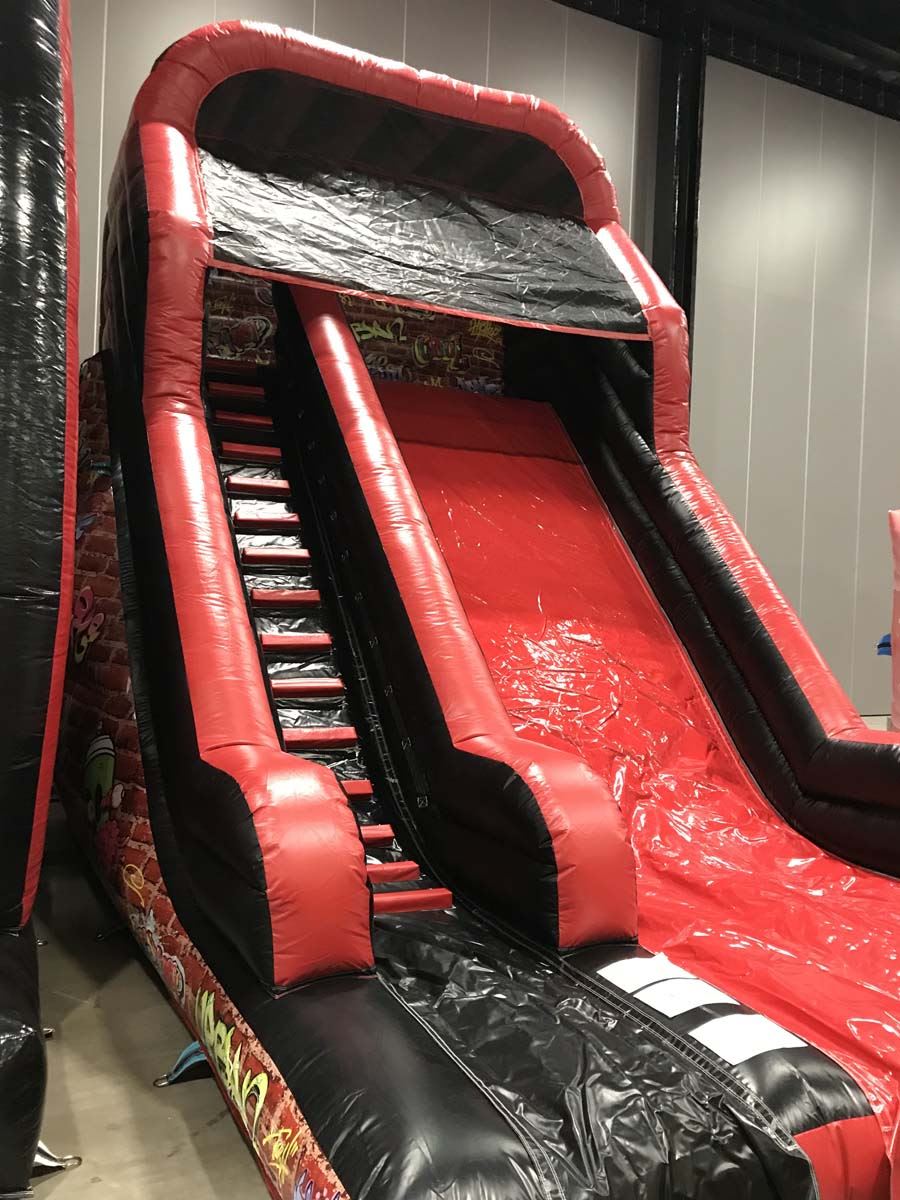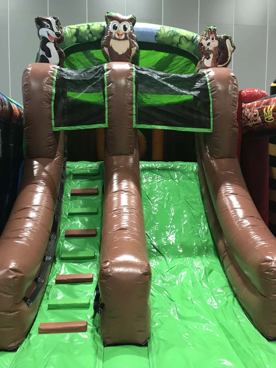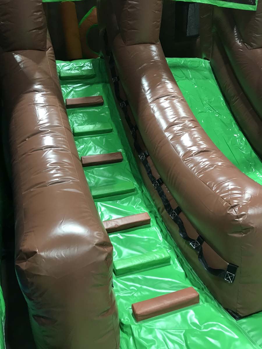 The slide was inflatable, but they have a platform you climb to get to the top. This platform typically would normally be scaffolding or a wooded stand that you see at a fun-fair. Instead, Airquee have made that part a seal unit and included spider webbing so children climb vertically upwards in tiers. Very hard for them to fall through, but in an edge case where this does happen the impact area is extremely well padded.