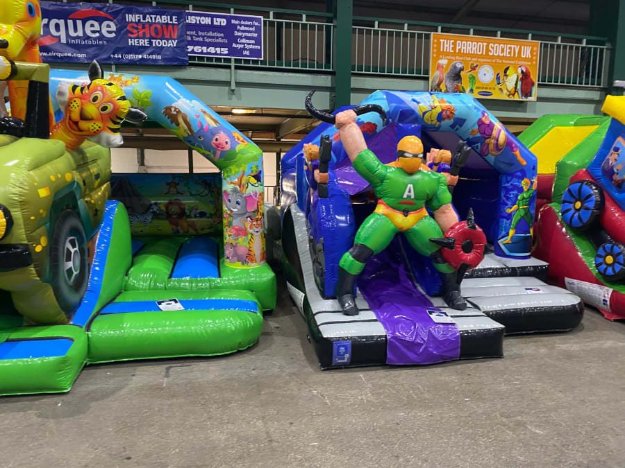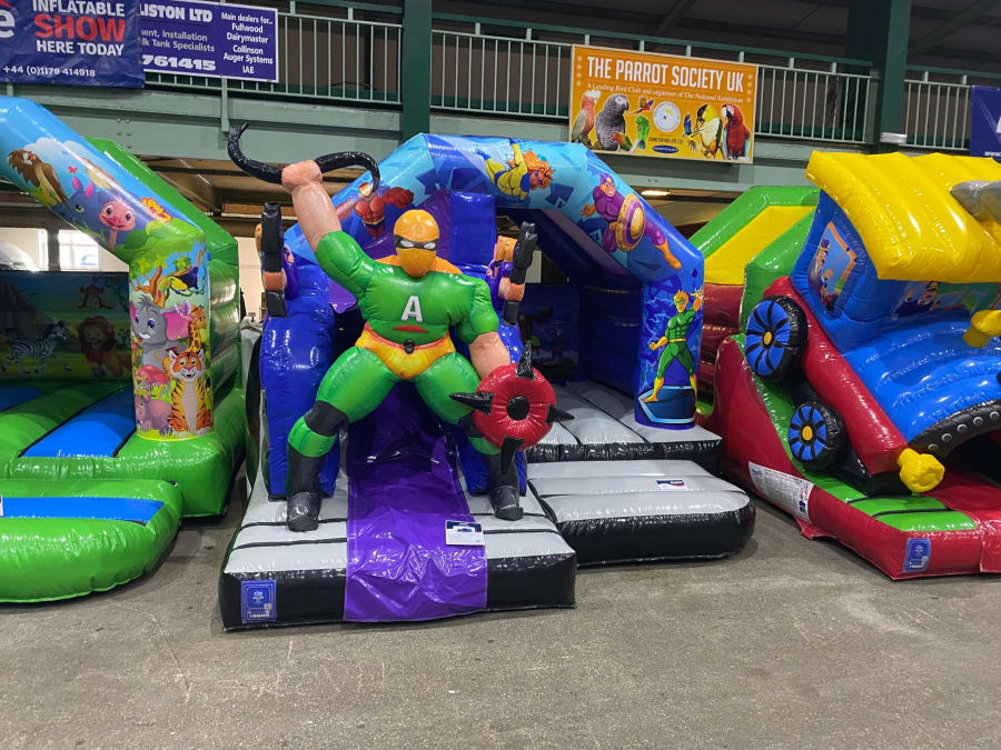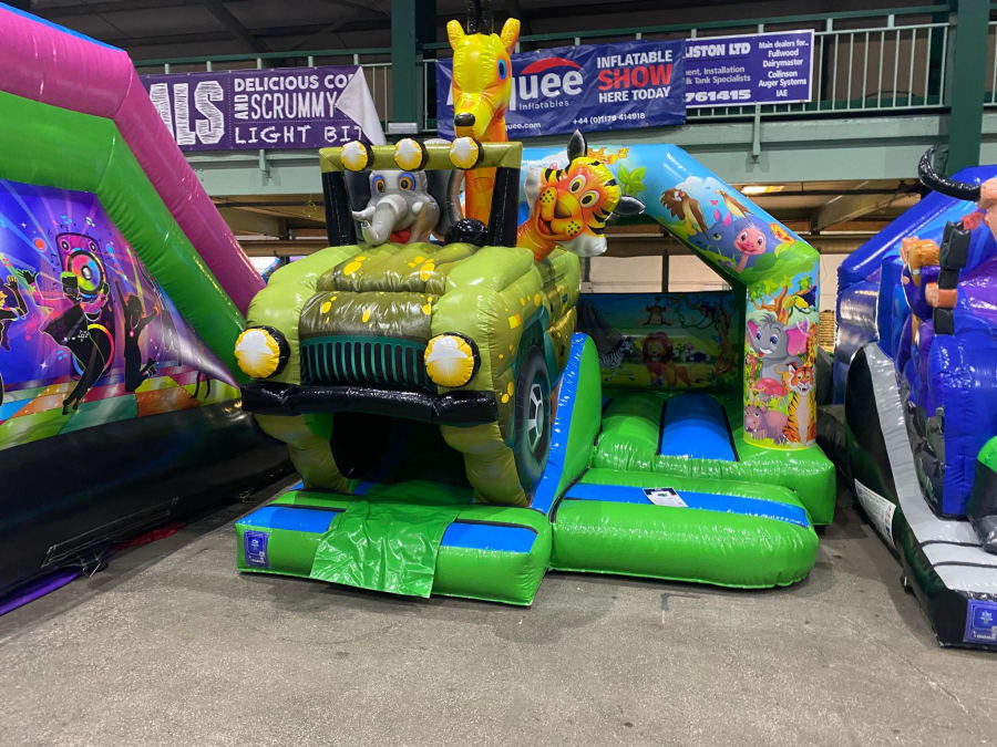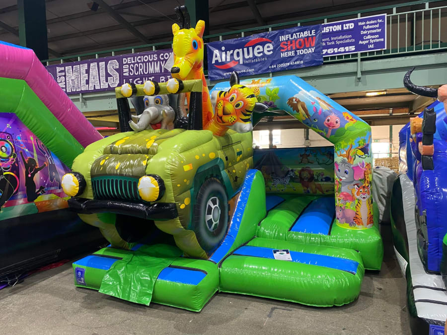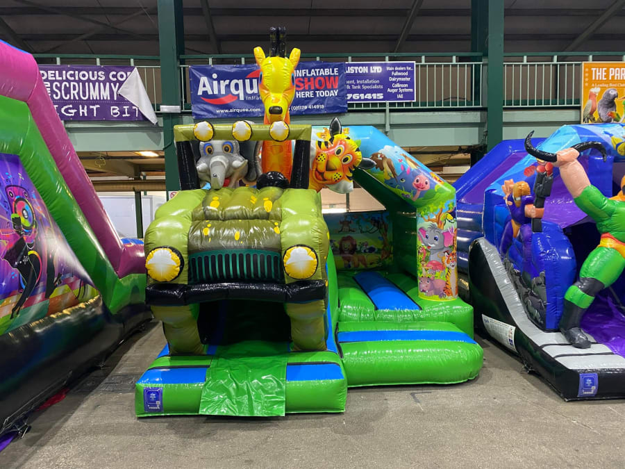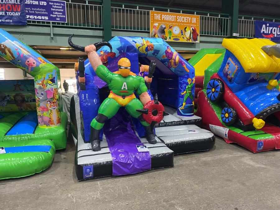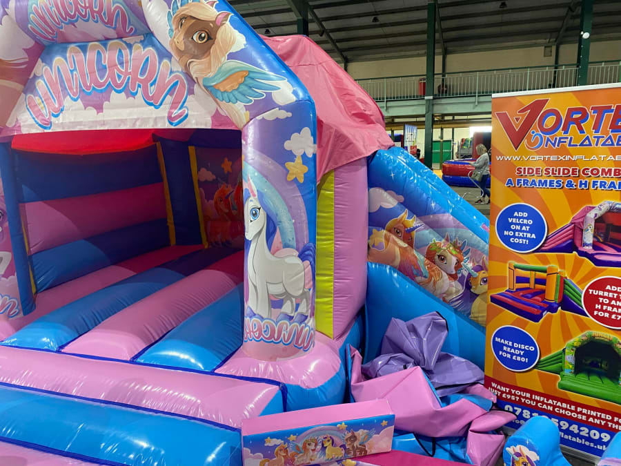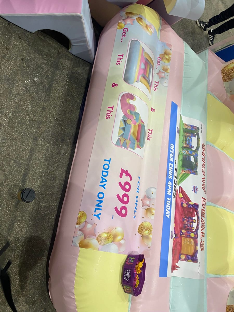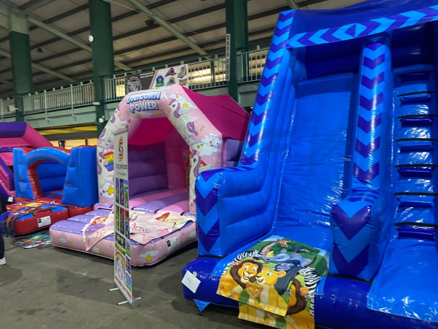 There was a front slide bouncy castle, a good size that compared to any other on the market. It was disco ready with light and speaker pouch. It had a fitted rain cover and the material used is better than I have ever seen them use previously. It had velcro strips on the front and came with a set of artwork, too. It had seatbelt webbing, come in either cape material or even gloss at no extra cost and was all sewn on a twin needle machine. There was no pinch points, no unnecessary stress areas, it was straight and had no twists. This was on offer for £900 - Which is quite unbelievable. No one else is offering prices quite like that.