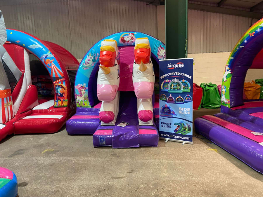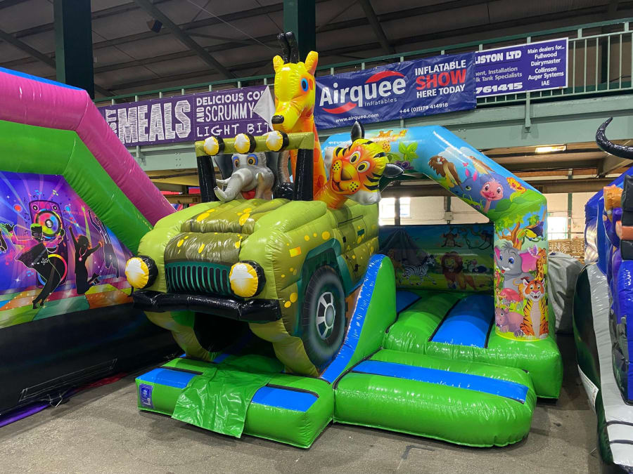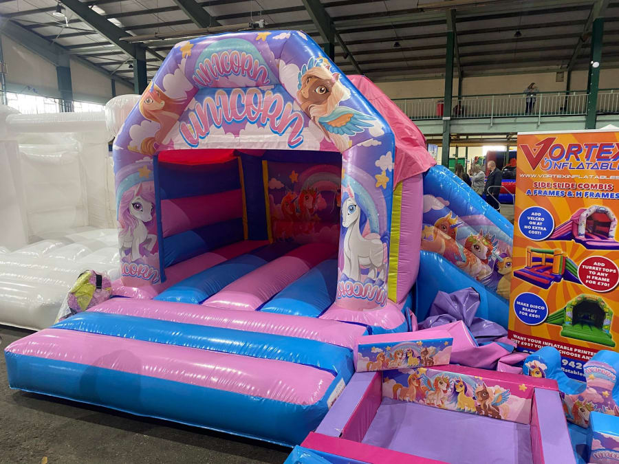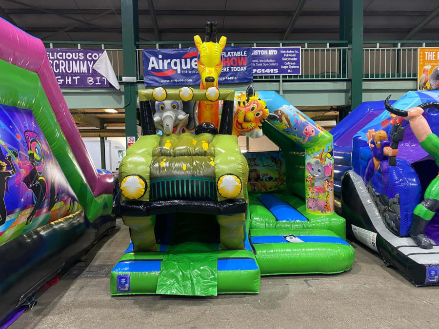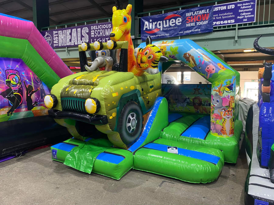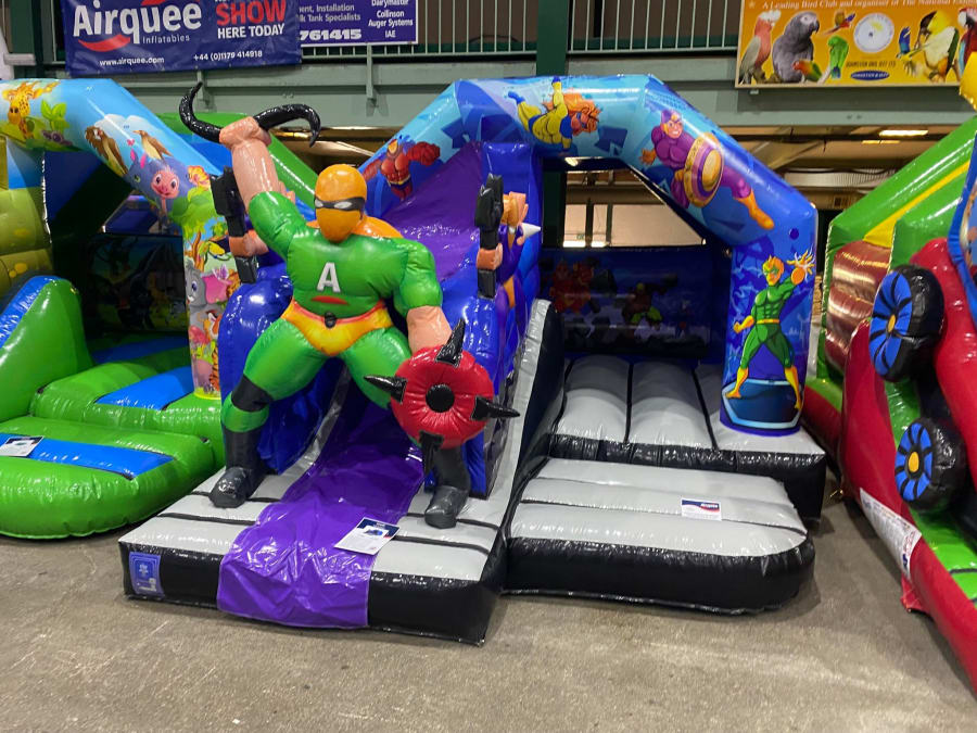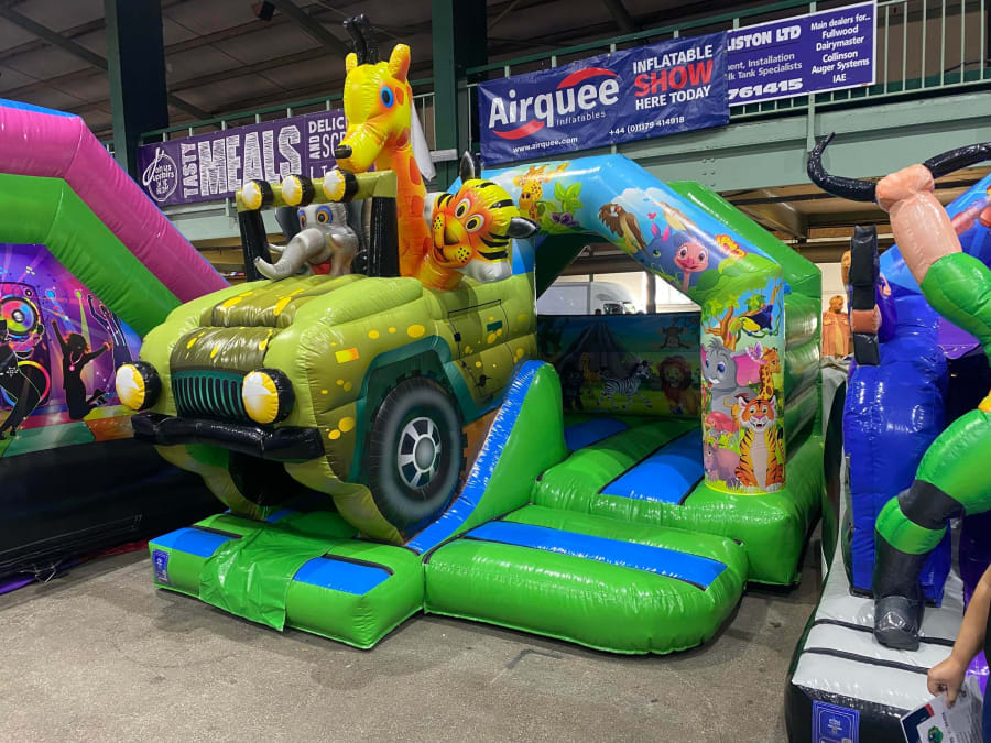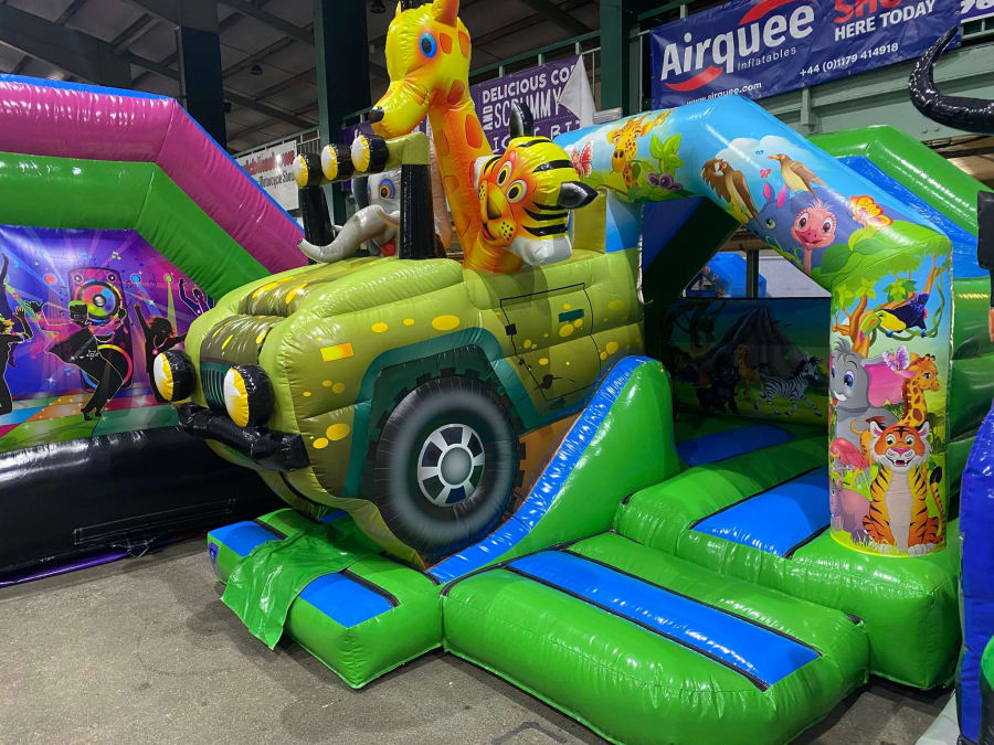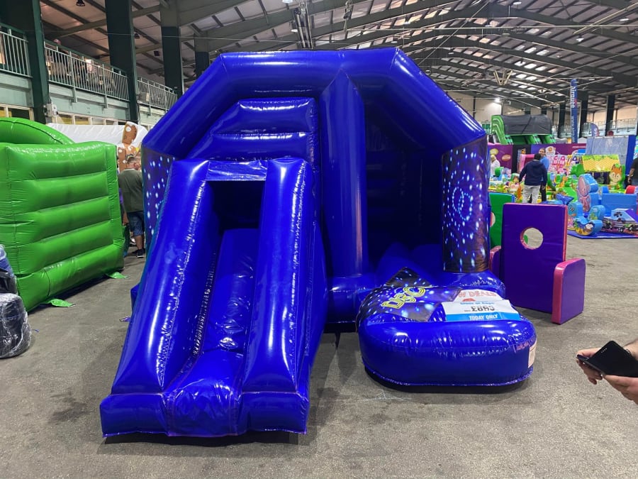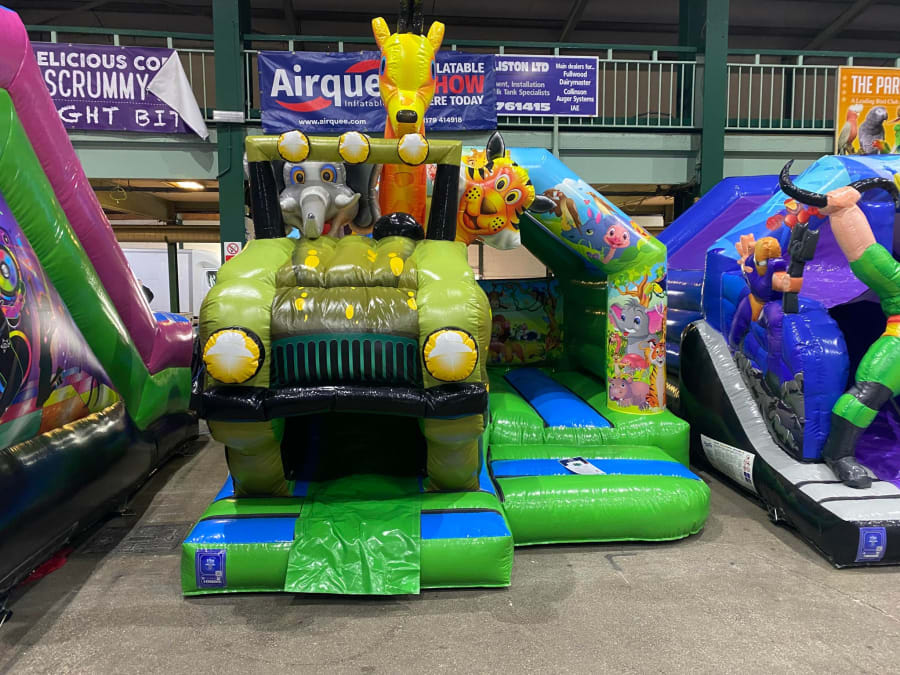 There was a front slide bouncy castle, a good size that compared to any other on the market. It was disco ready with light and speaker pouch. It had a fitted rain cover and the material used is better than I have ever seen them use previously. It had velcro strips on the front and came with a set of artwork, too. It had seatbelt webbing, come in either cape material or even gloss at no extra cost and was all sewn on a twin needle machine. There was no pinch points, no unnecessary stress areas, it was straight and had no twists. This was on offer for £900 - Which is quite unbelievable. No one else is offering prices quite like that.