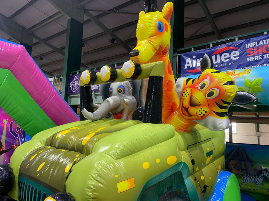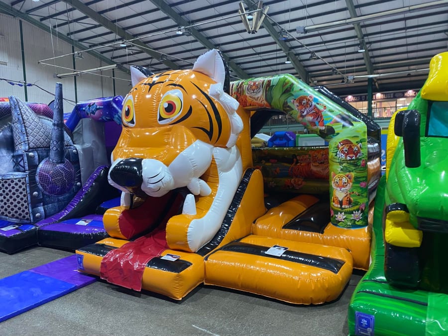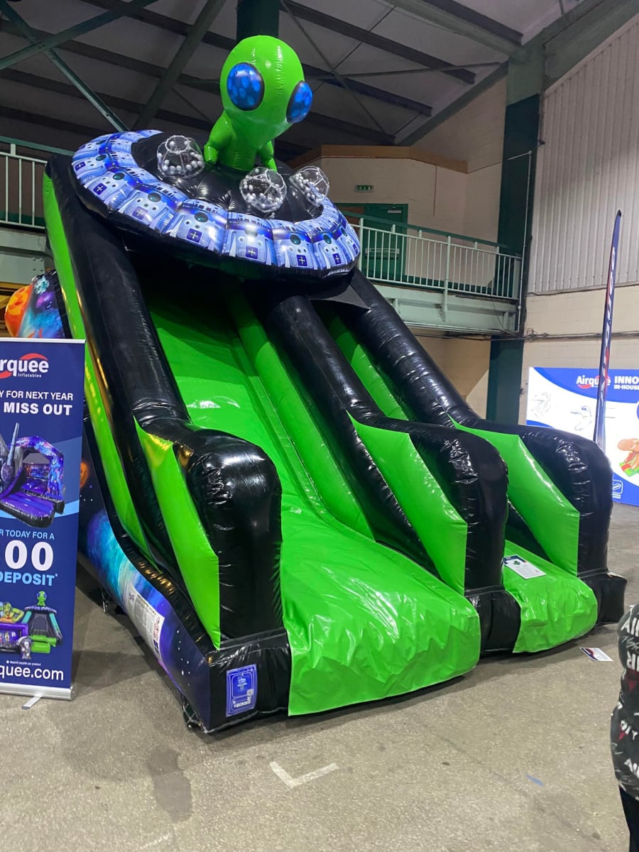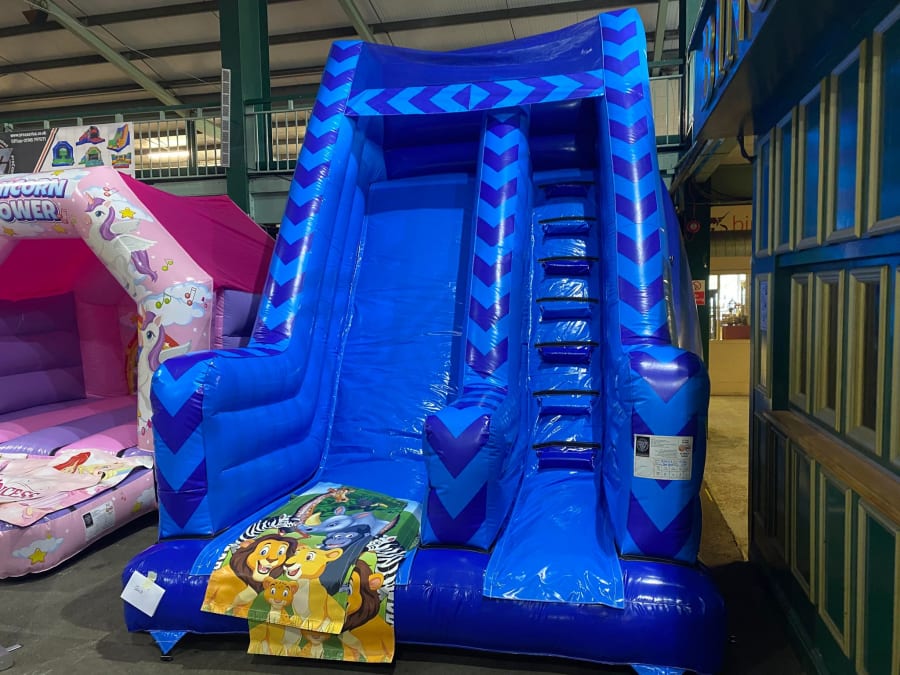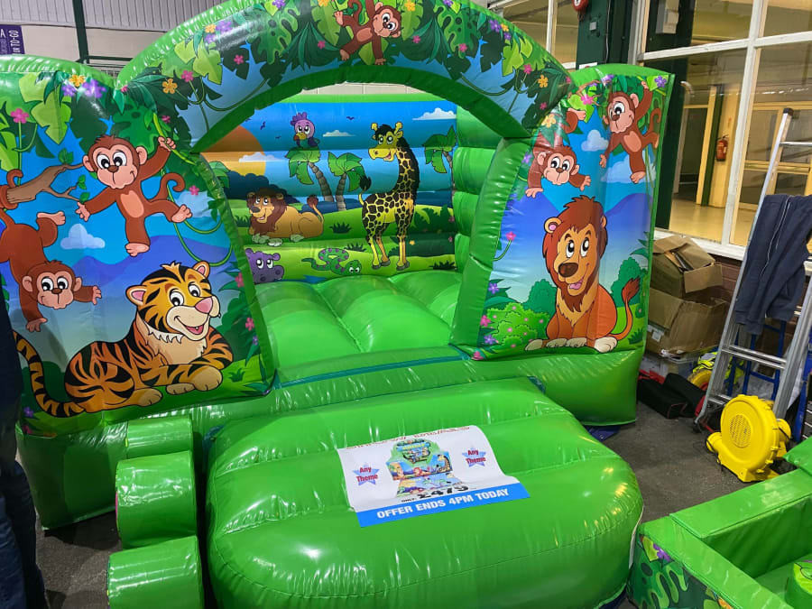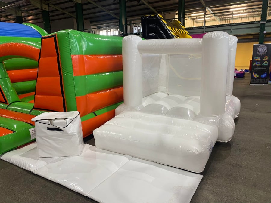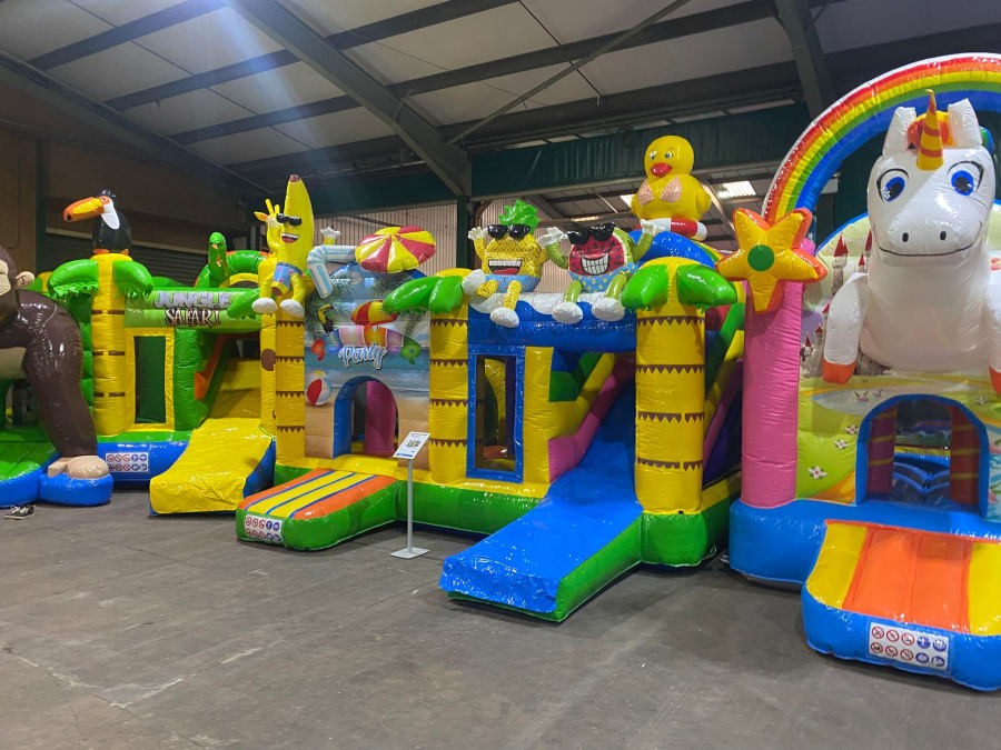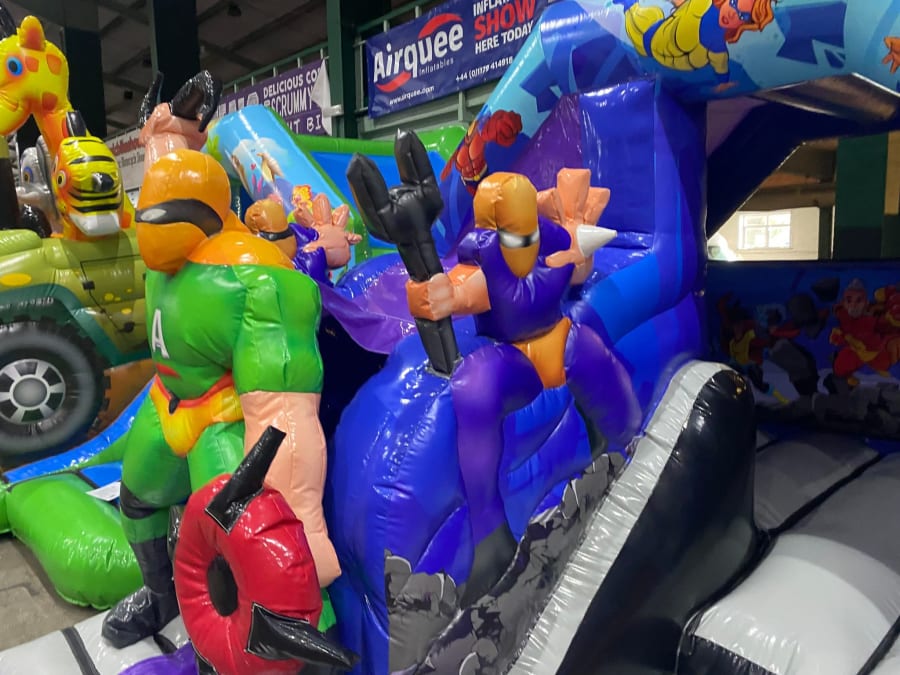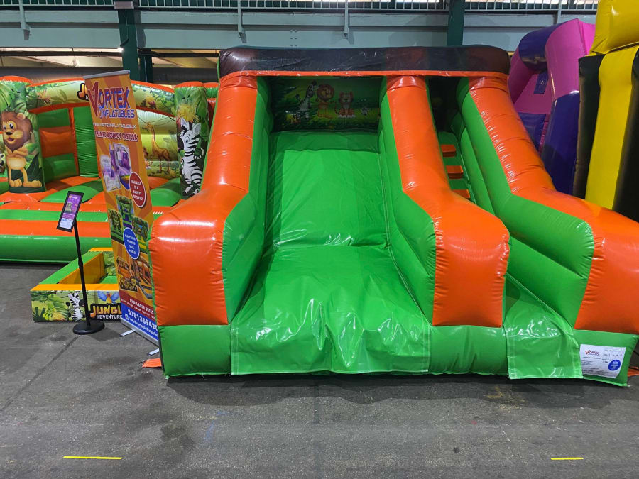 There was a front slide bouncy castle, a good size that compared to any other on the market. It was disco ready with light and speaker pouch. It had a fitted rain cover and the material used is better than I have ever seen them use previously. It had velcro strips on the front and came with a set of artwork, too. It had seatbelt webbing, come in either cape material or even gloss at no extra cost and was all sewn on a twin needle machine. There was no pinch points, no unnecessary stress areas, it was straight and had no twists. This was on offer for £900 - Which is quite unbelievable. No one else is offering prices quite like that.