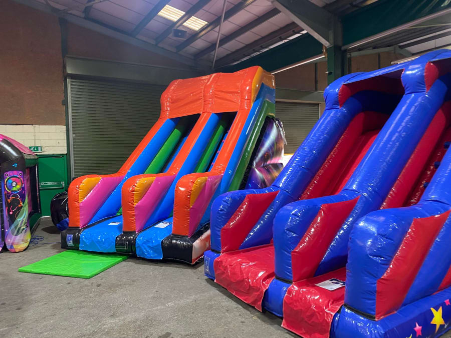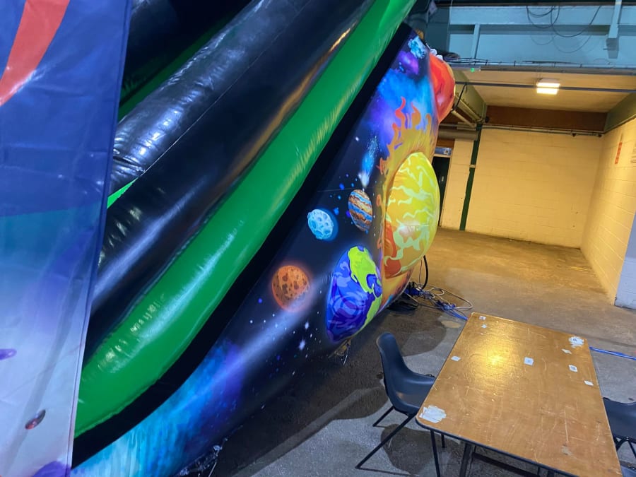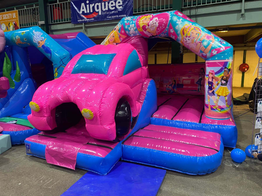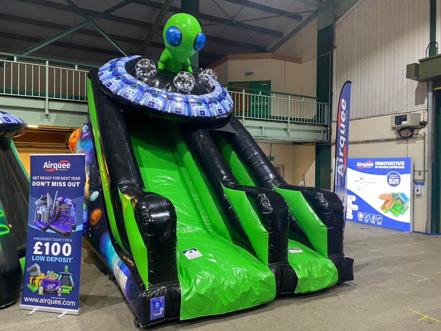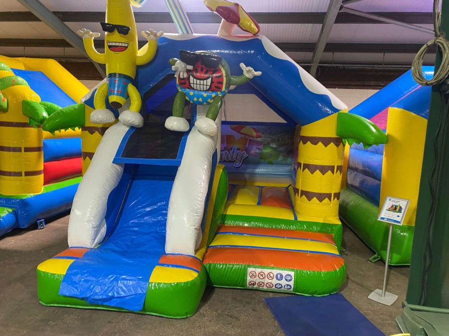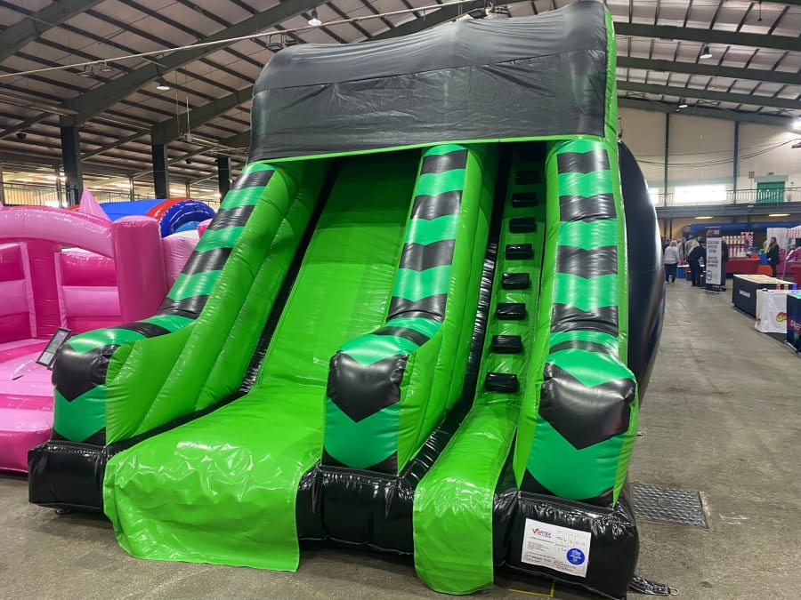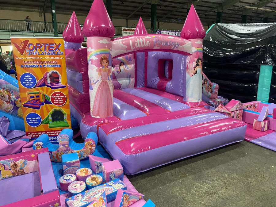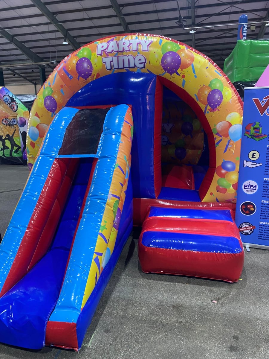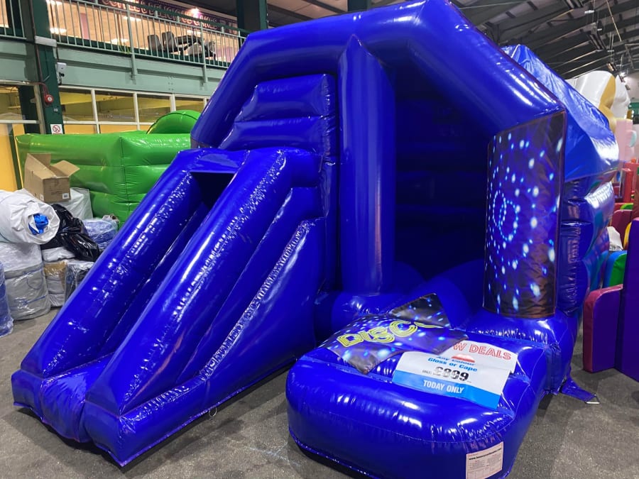 There was a front slide bouncy castle, a good size that compared to any other on the market. It was disco ready with light and speaker pouch. It had a fitted rain cover and the material used is better than I have ever seen them use previously. It had velcro strips on the front and came with a set of artwork, too. It had seatbelt webbing, come in either cape material or even gloss at no extra cost and was all sewn on a twin needle machine. There was no pinch points, no unnecessary stress areas, it was straight and had no twists. This was on offer for £900 - Which is quite unbelievable. No one else is offering prices quite like that.