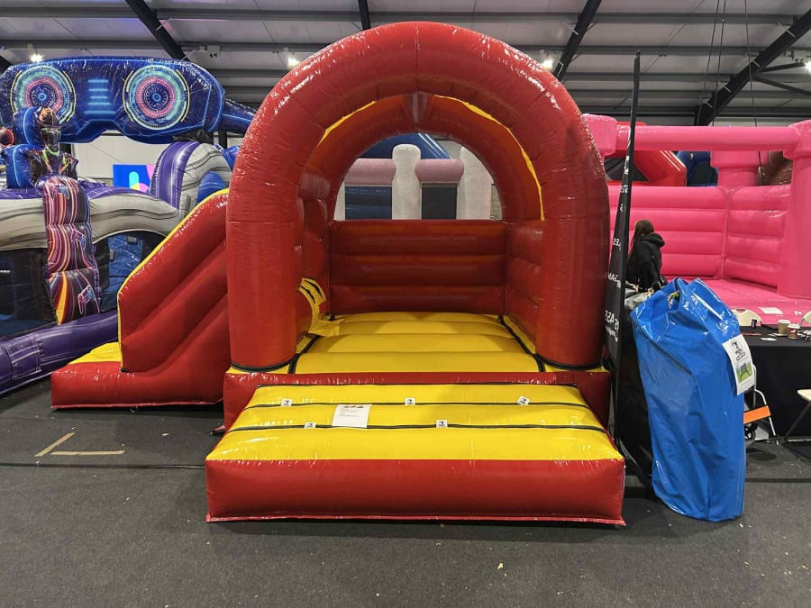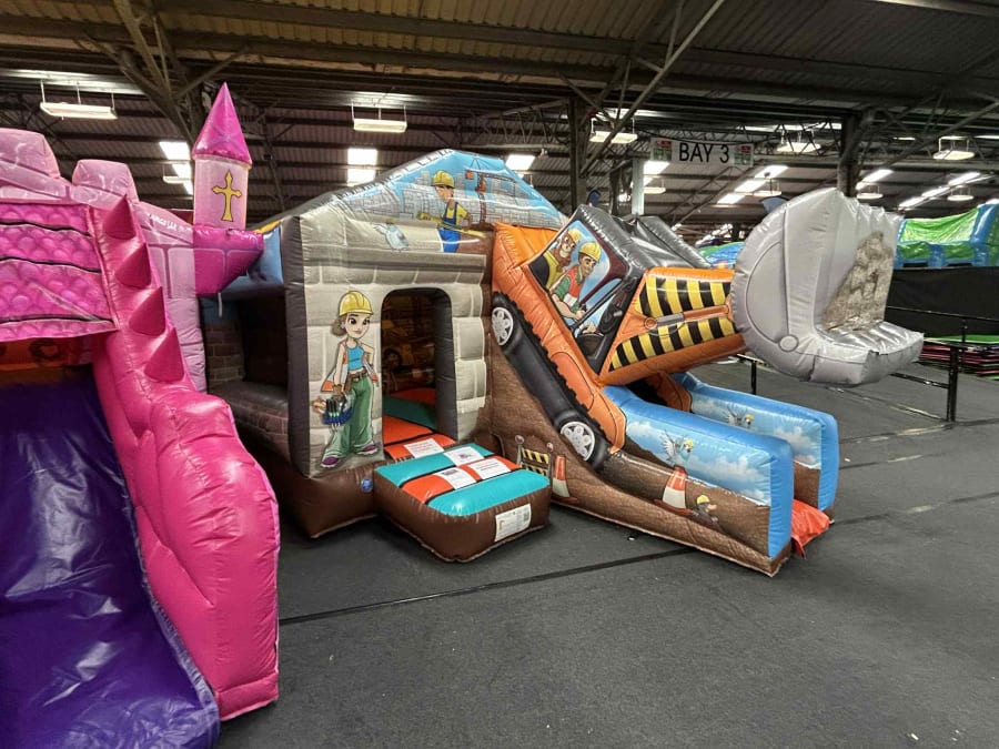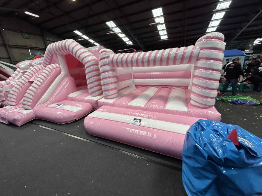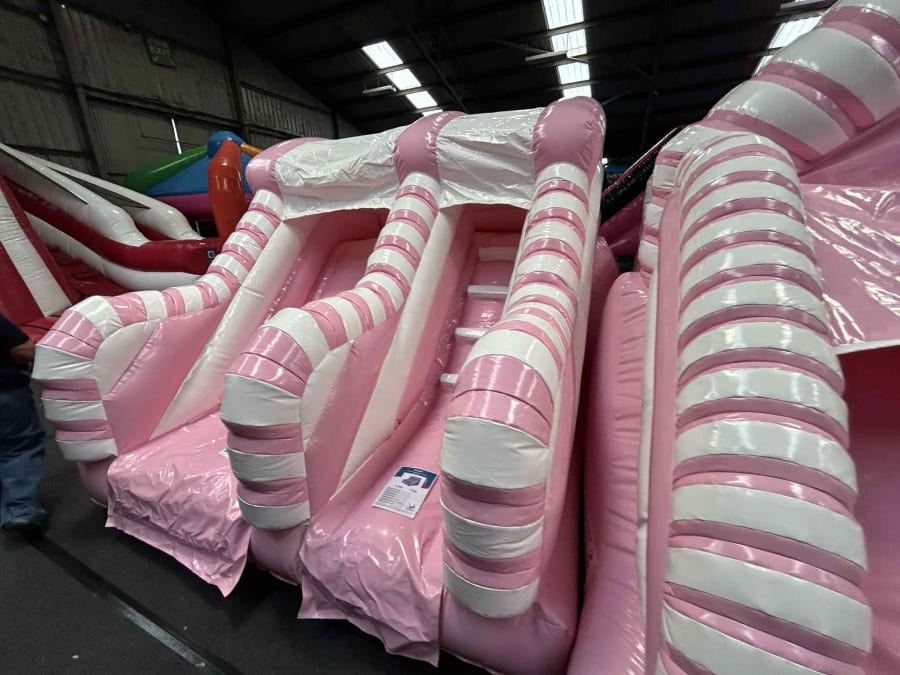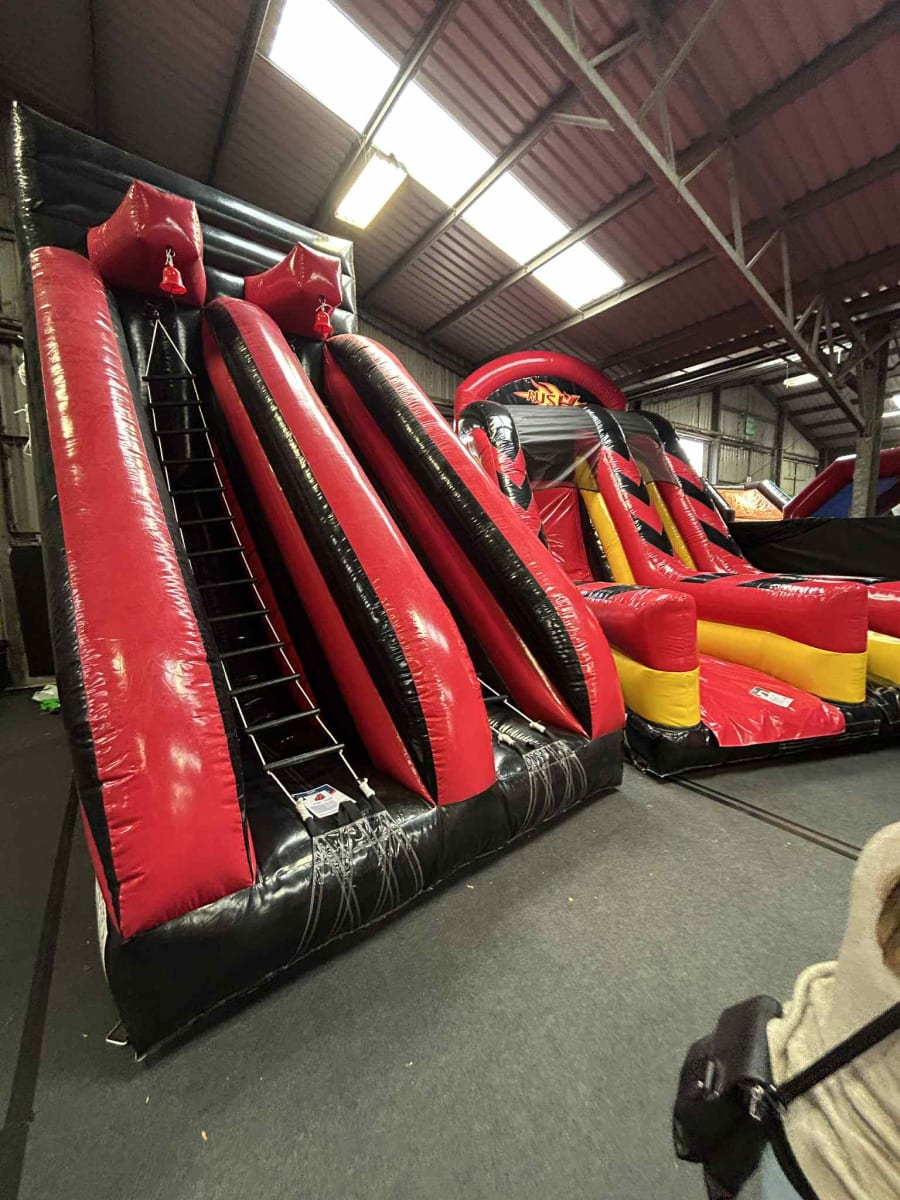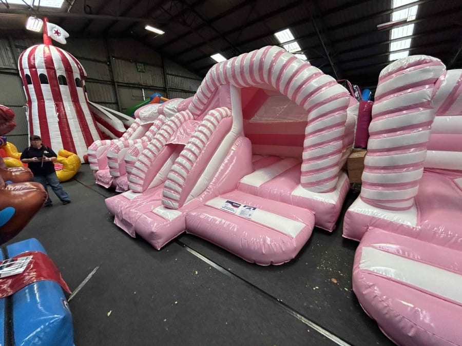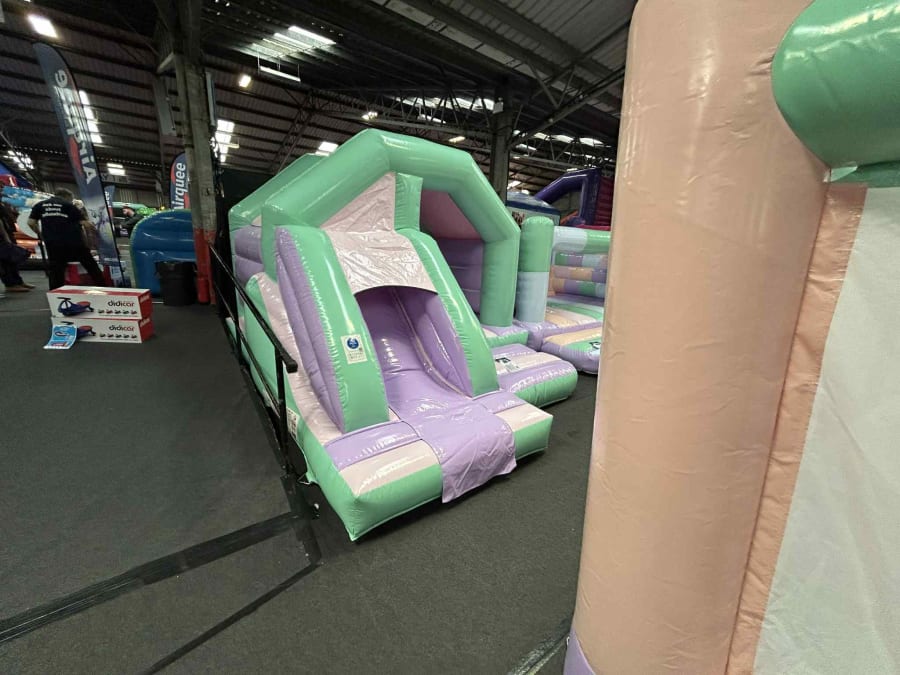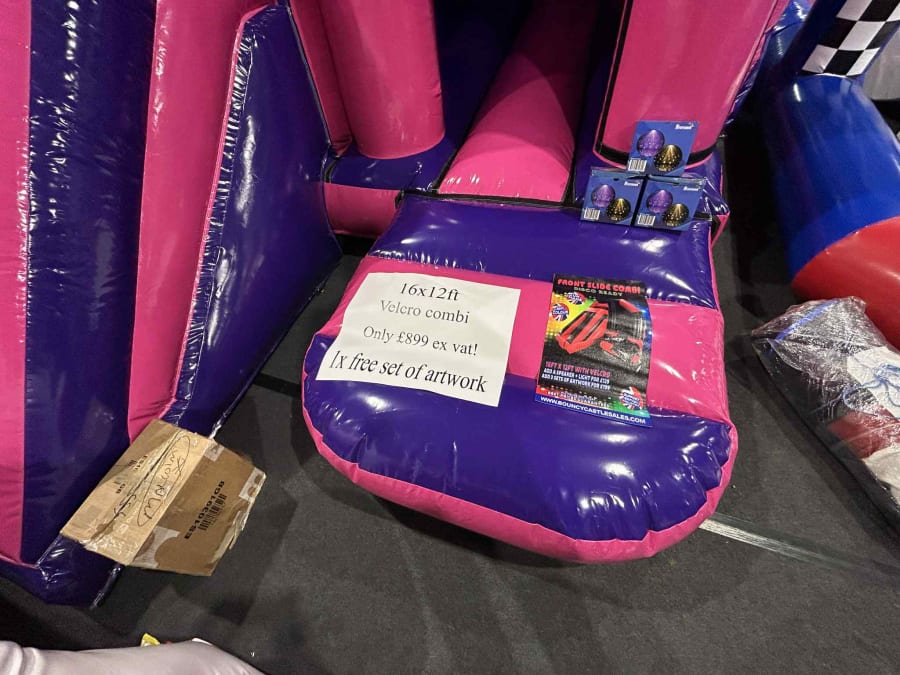 There was much more too - They showed their new dual lane front slide combi castles. These aren’t two separate slides, but instead it’s basically a front slide combi castle that’s a few foot wider to accommodate a much wider slide that’s seperated into two slides with a barrier running down the middle and two sets of steps on the inside next to each other. Essentially splitting the slide into two halves rather than two separate ones.