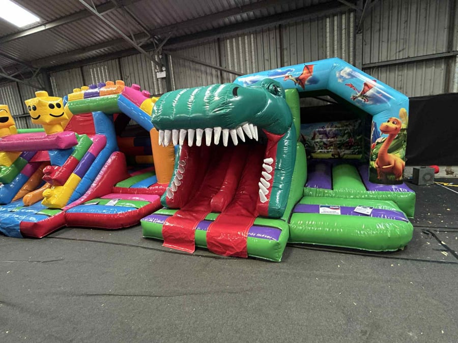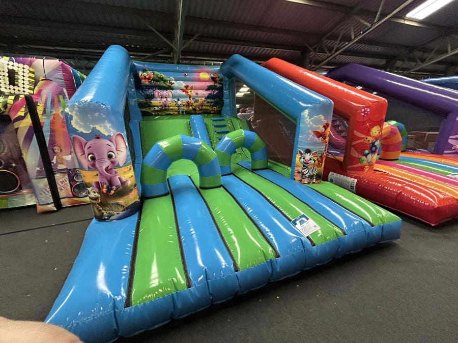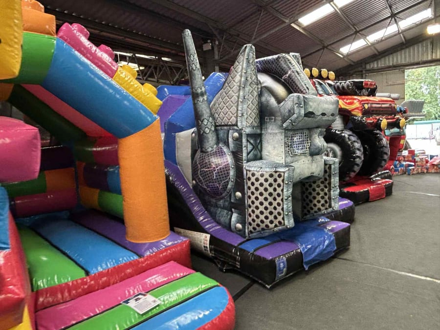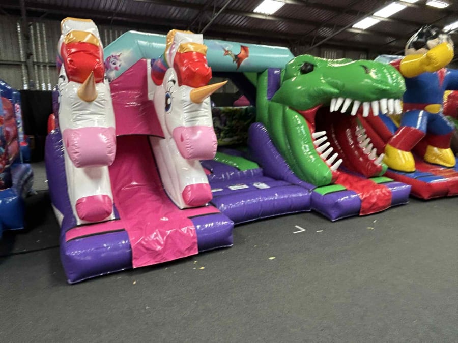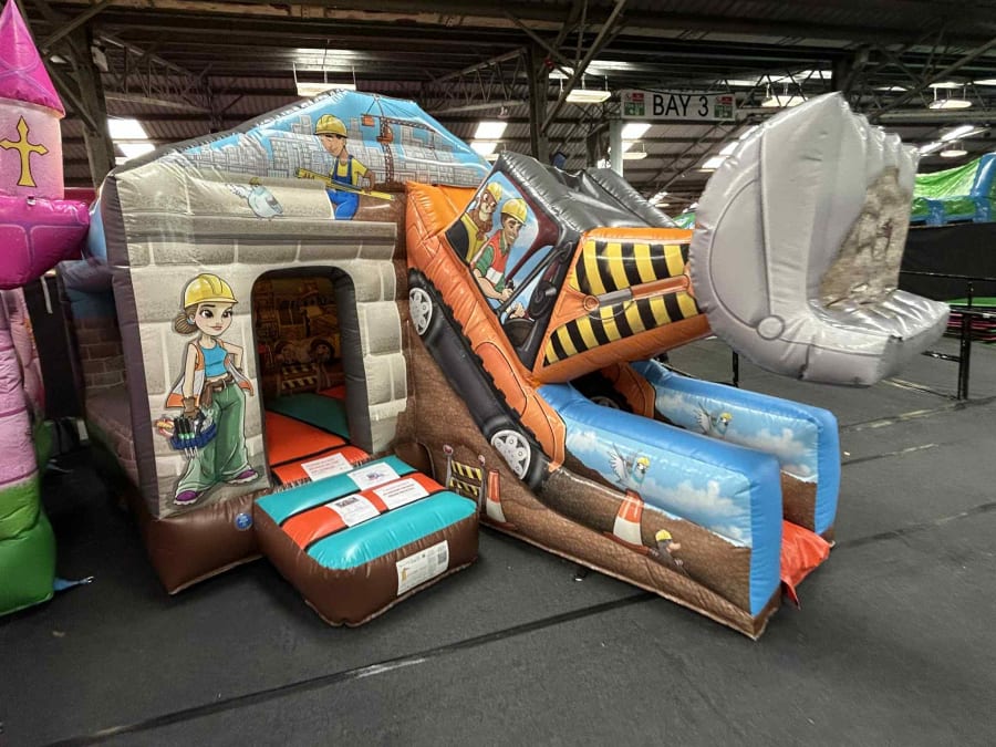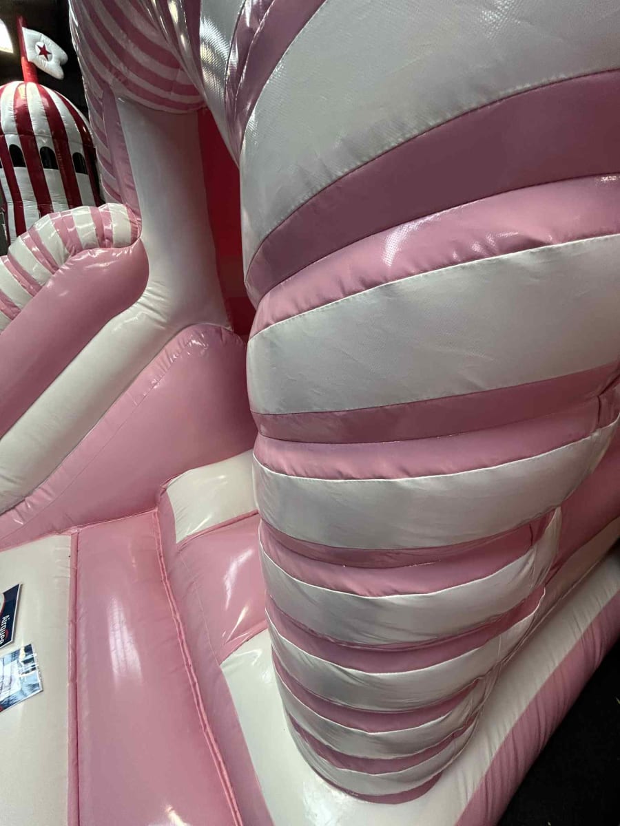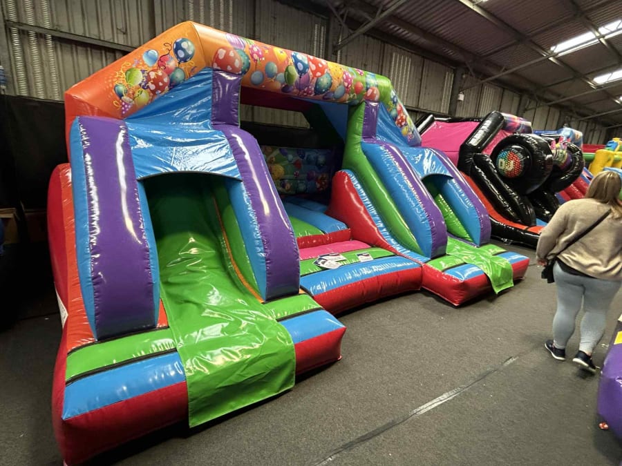 There was much more too - They showed their new dual lane front slide combi castles. These aren’t two separate slides, but instead it’s basically a front slide combi castle that’s a few foot wider to accommodate a much wider slide that’s seperated into two slides with a barrier running down the middle and two sets of steps on the inside next to each other. Essentially splitting the slide into two halves rather than two separate ones.