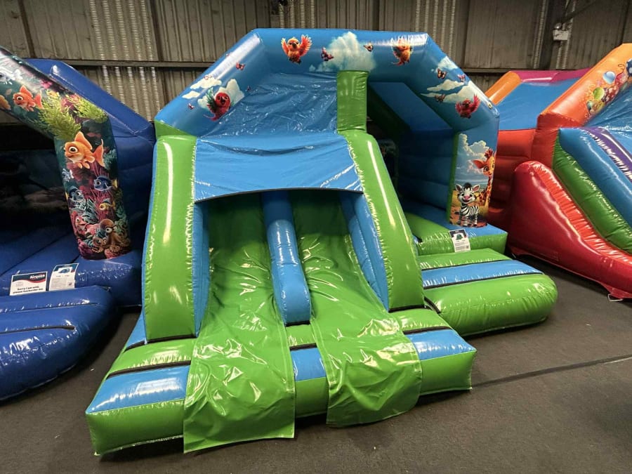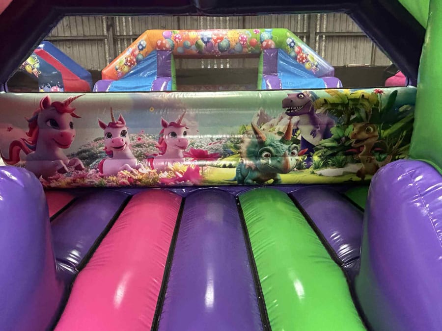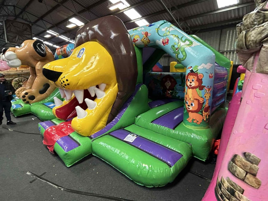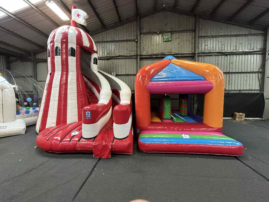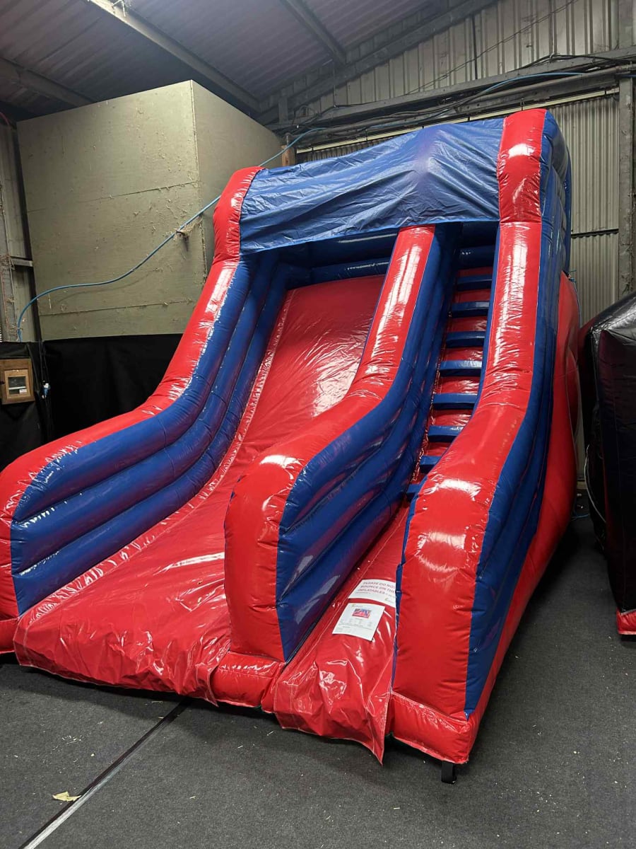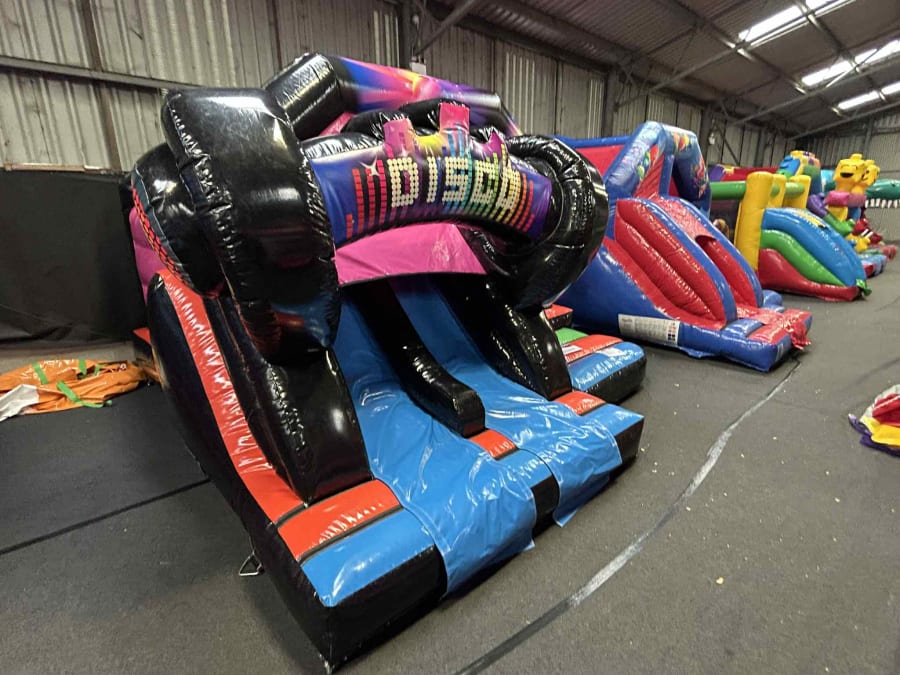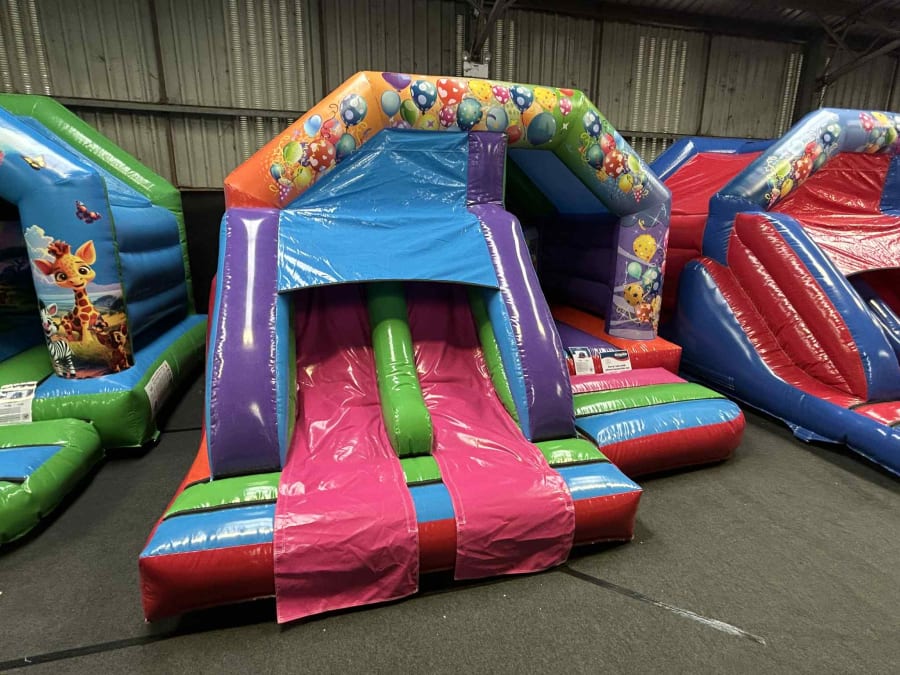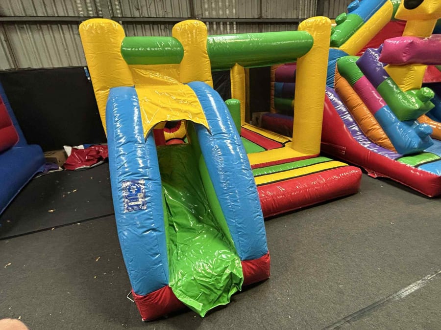 There was much more too - They showed their new dual lane front slide combi castles. These aren’t two separate slides, but instead it’s basically a front slide combi castle that’s a few foot wider to accommodate a much wider slide that’s seperated into two slides with a barrier running down the middle and two sets of steps on the inside next to each other. Essentially splitting the slide into two halves rather than two separate ones.