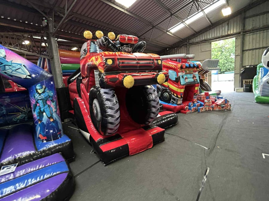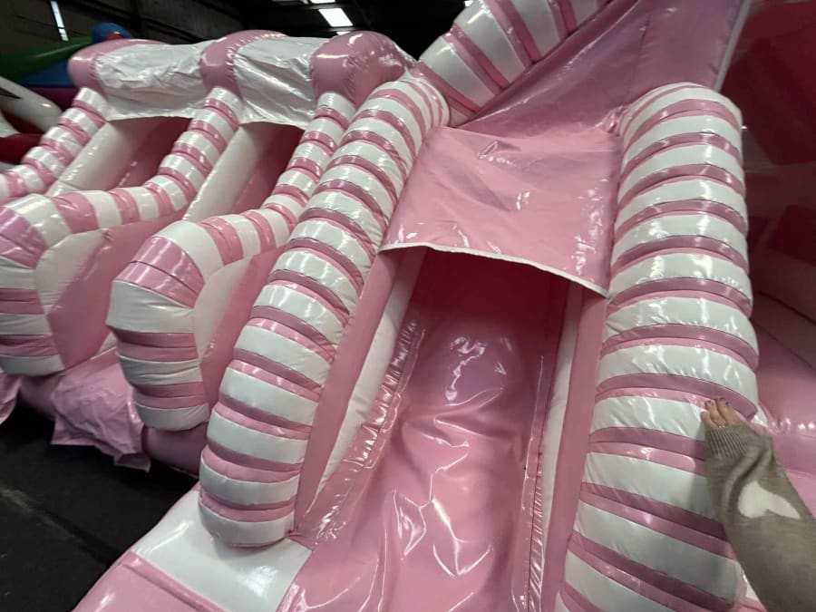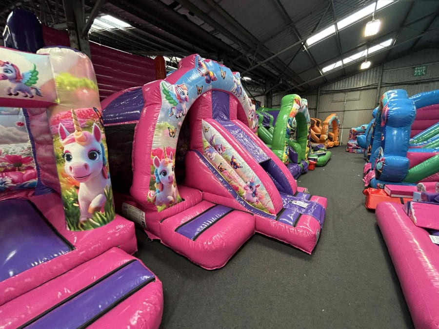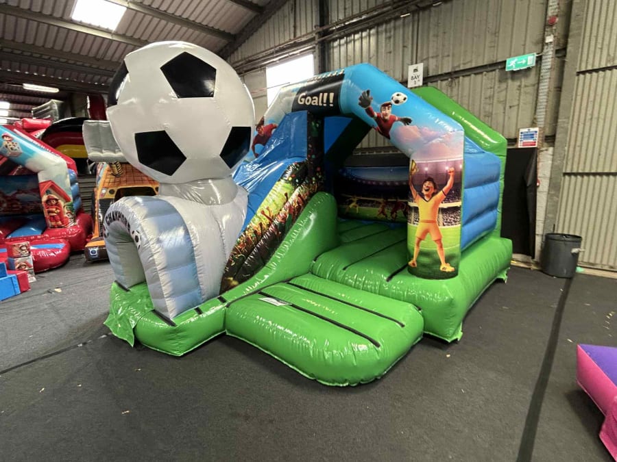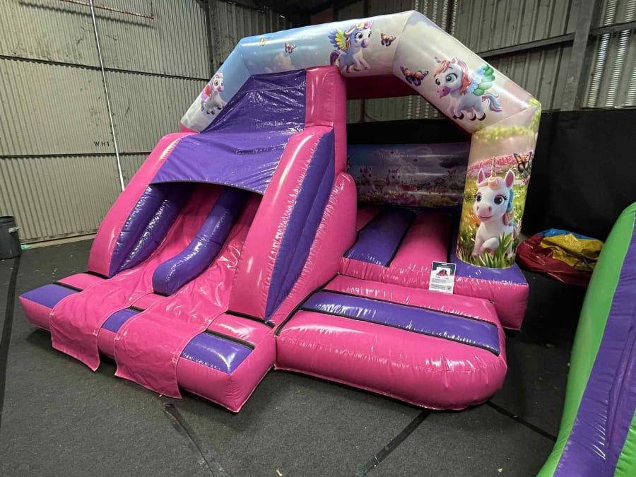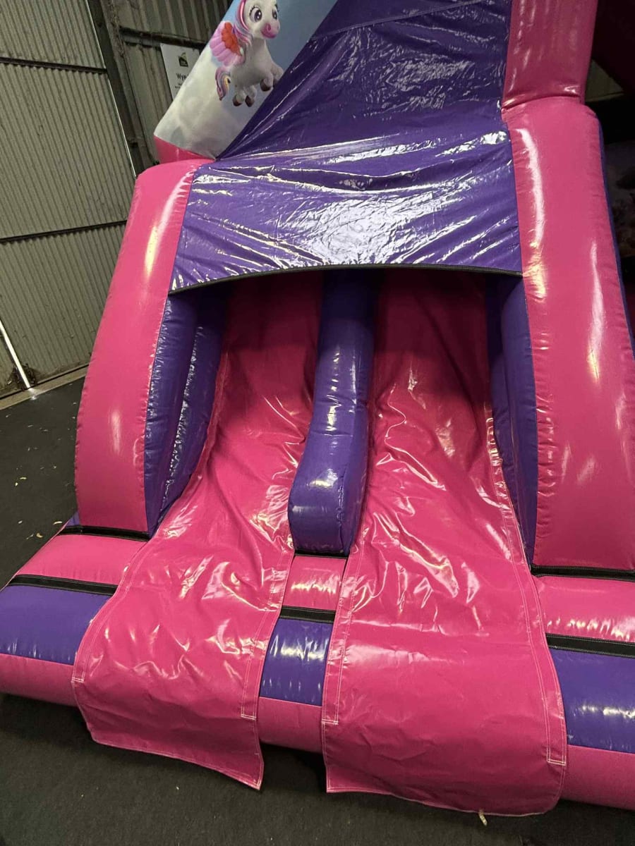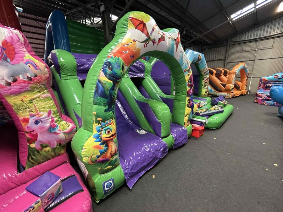 There was much more too - They showed their new dual lane front slide combi castles. These aren’t two separate slides, but instead it’s basically a front slide combi castle that’s a few foot wider to accommodate a much wider slide that’s seperated into two slides with a barrier running down the middle and two sets of steps on the inside next to each other. Essentially splitting the slide into two halves rather than two separate ones.