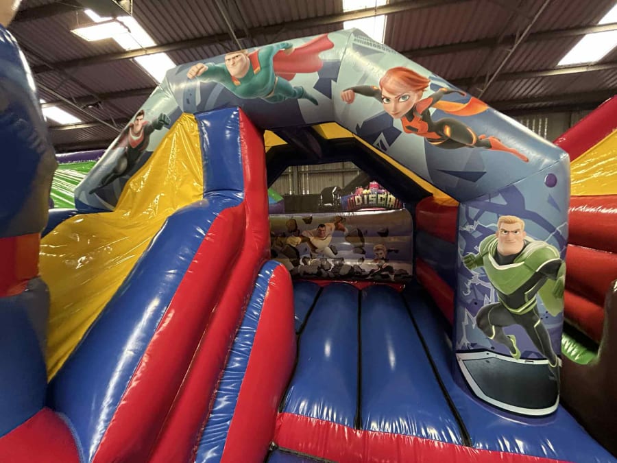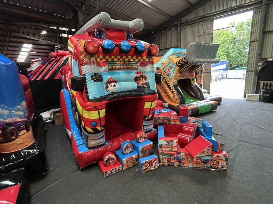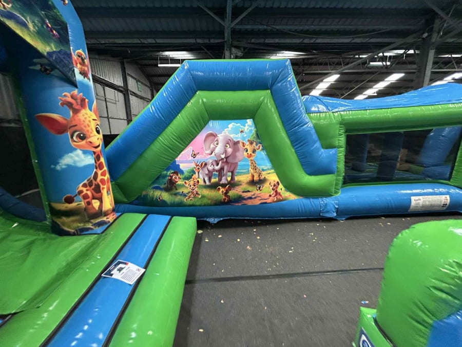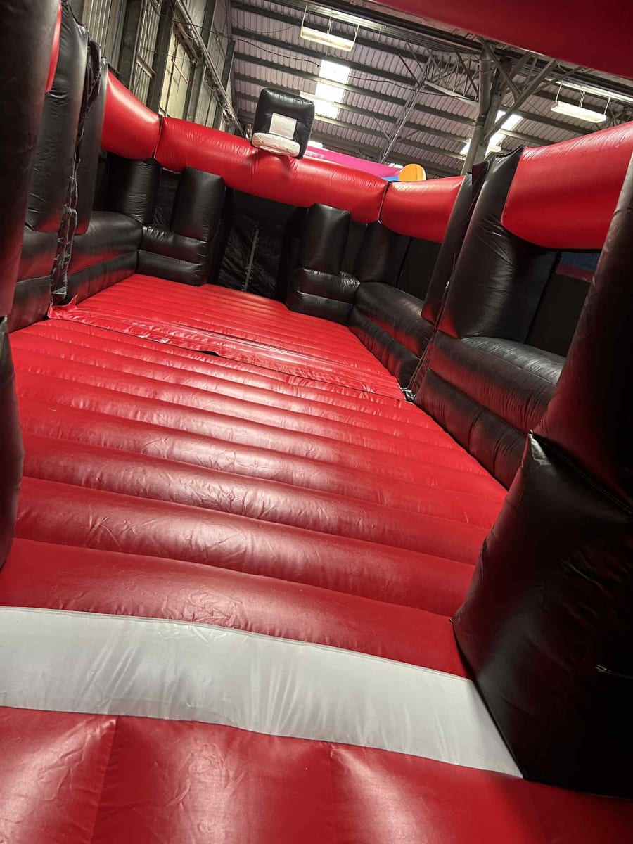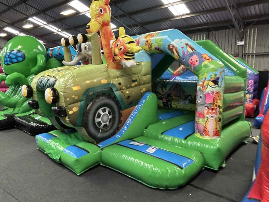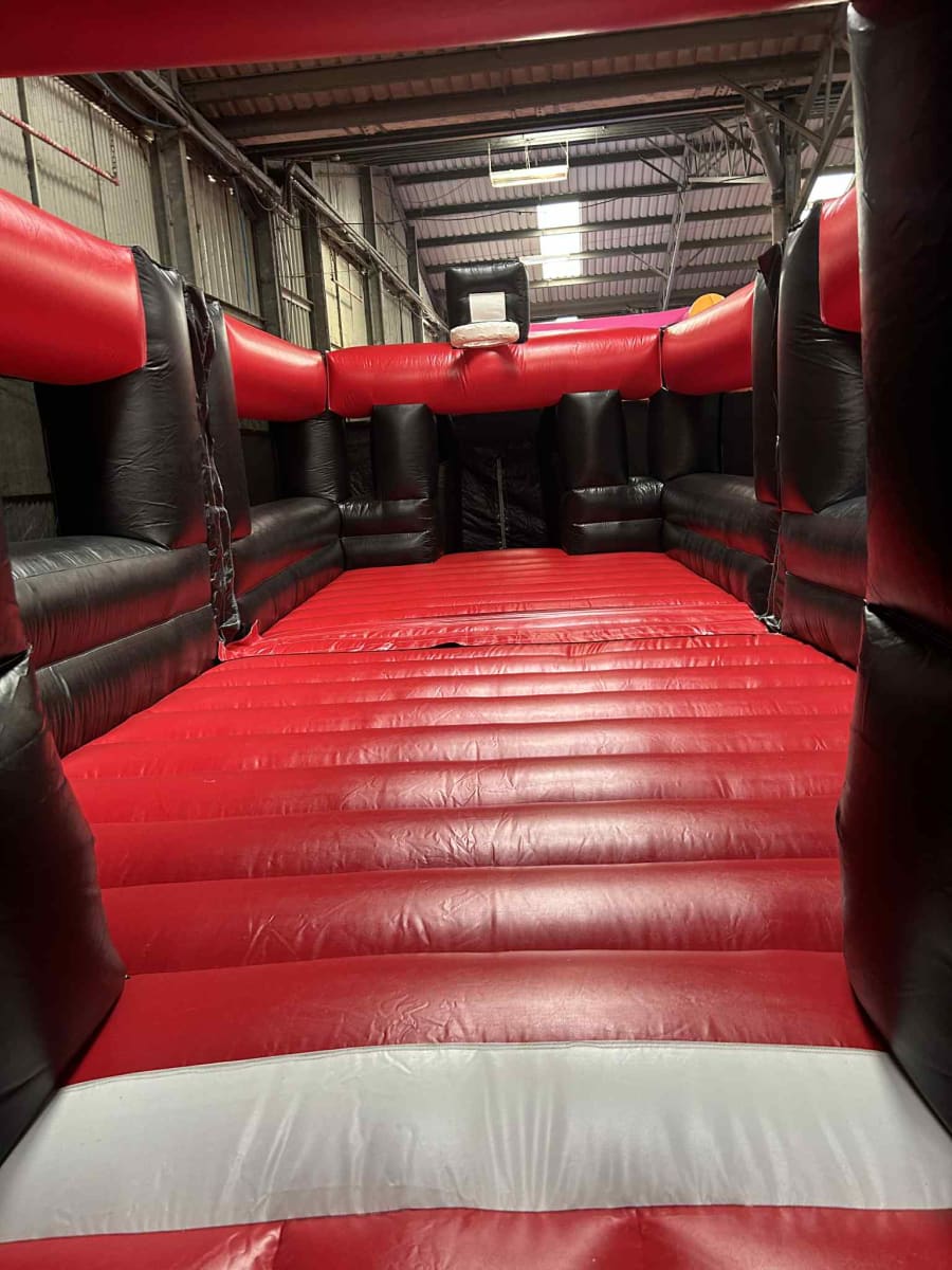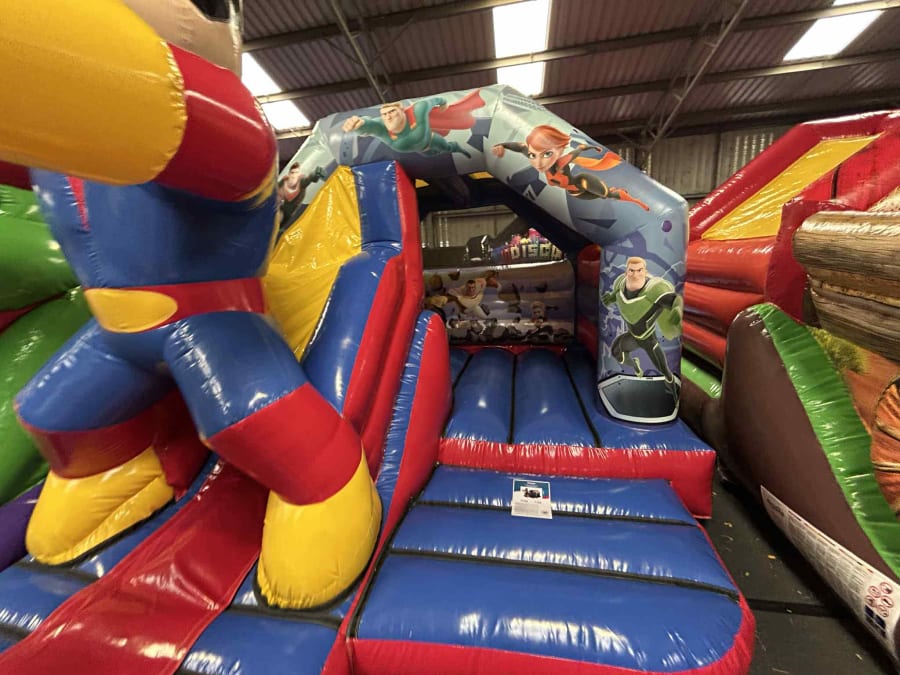 There was much more too - They showed their new dual lane front slide combi castles. These aren’t two separate slides, but instead it’s basically a front slide combi castle that’s a few foot wider to accommodate a much wider slide that’s seperated into two slides with a barrier running down the middle and two sets of steps on the inside next to each other. Essentially splitting the slide into two halves rather than two separate ones.