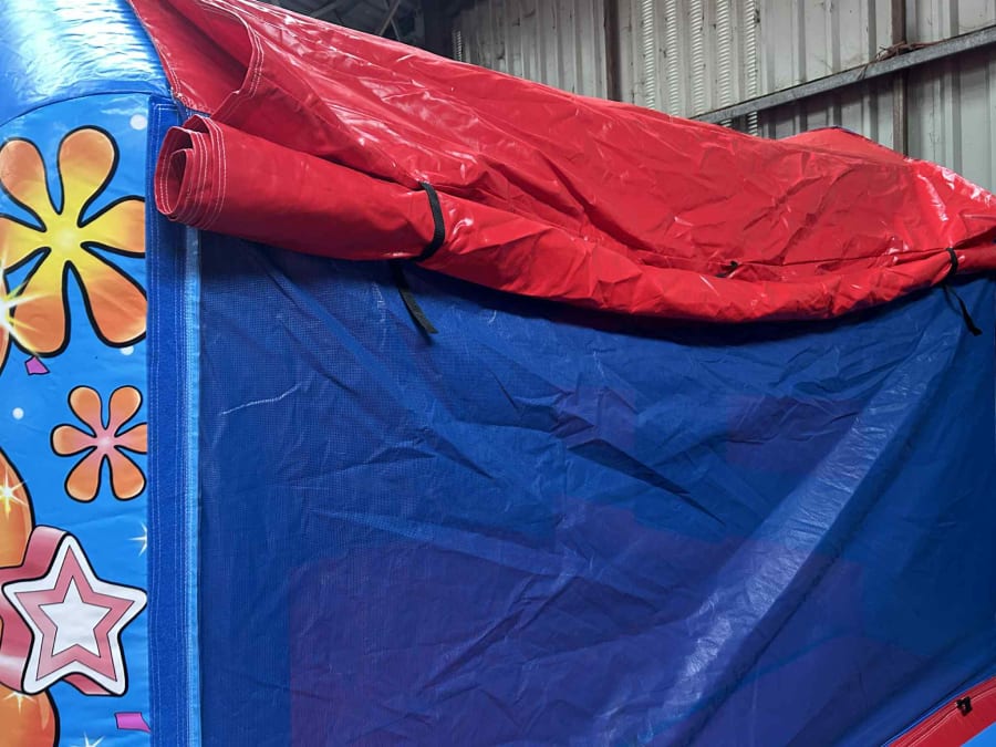 The turrets bigger than usual. This is an important point - Rolls of bouncy castle material are 150cm wide, so rather than creating a pattern that doesn’t care about this limiting factor, you design the castle based on making the most use out of the roll; That’s hard with turrets because they’re either going to be way too big or too thin, but Clive has done something clever to not compromise on quality or the integrity of the build and used a filler to exterd the circumference.